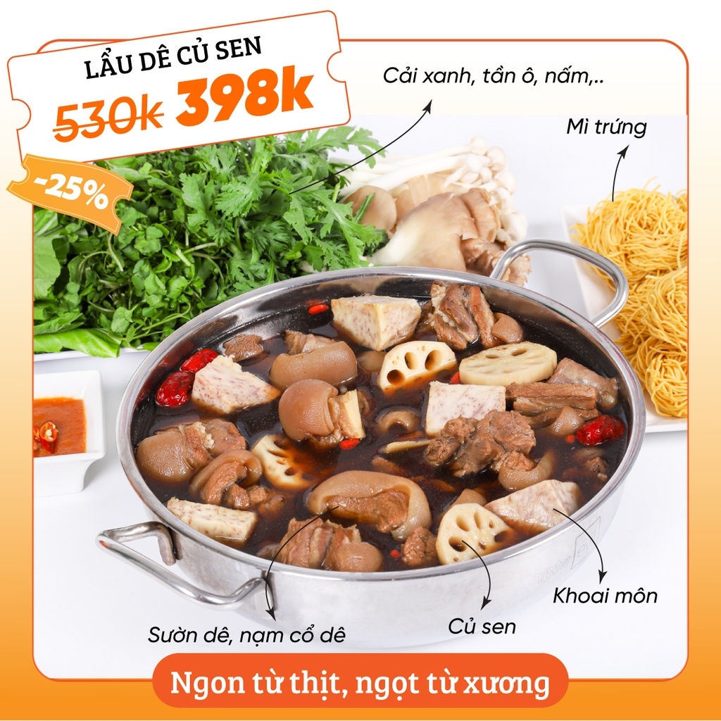 Với sự chỉnh chu của đầu bếp, món Lẩu Dê Củ Sen kết hợp từ sườn sê có xương và nạm cổ không xương cùng với củ sen, khoai môn… và các gia vị nấu lẩu dê đặc trưng. Ăn kèm rau cải xanh, nấm, tần ô và mì trứng. Món lẩu dê mới này của FLYFOOD sẽ mang đến sự hài lòng tuyệt đối.